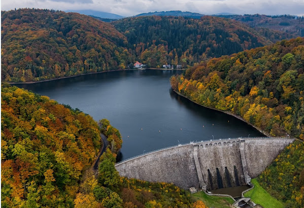 Jezioro Bystrzyckie: Postój na tamie w Zagórzu Śląskim z widokiem na góry.